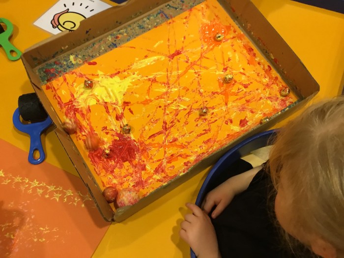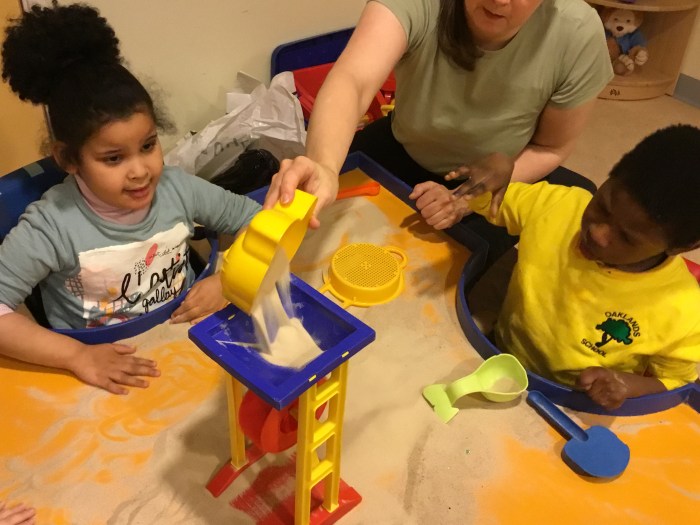 There was lots of mess at the sand table. The pupils have been exploring dry sand and wet sand and experimenting with moulding, pouring, and creating patterns with tools and their fingers.